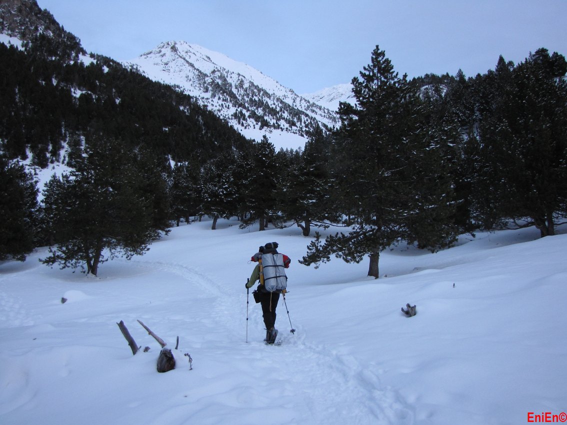 El objetivo fundamental de esta salida era pasar la Nochevieja en la nieve. Hacer algo mas no entraba en los planes, ya que las predicciones meteorológicas no eran buenas. Pero una vez aquí, y como el tiempo si no bueno sí parece estable, sería un crimen no aprovechar la ocasión. Tenemos para nosotros solos todo el valle del Port de Rus cargado de nieve virgen y sin trazas, algo excepcional. En estas condiciones ir hasta el Port es casi obligado