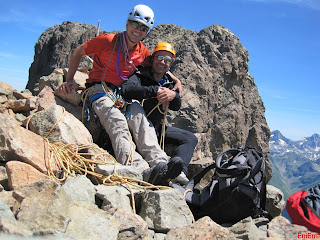 Estamos jodidos pero muy contentos. No podemos quitarnos la sonrisa de los labios. La subida ha sido larga, agotadora pero muy reconfortante. Sólo en el primer rapel del Petit Pic lo he pasado mal, y por una cuestión mas psicológica que real. El resto de la ascensión un maravilloso disfrute. La cumbre esta amueblada con un pequeño hito de piedras situado junto a un vivaque. Sentados en la pared del mismo bebemos, comemos, bromeamos...A tomar por el saco la falsa modestia. Nos sentimos orgullosos de nosotros mismos y no paramos de echarnos flores el uno al otro. No estamos solos en la cima. Los componentes de una cordada de dos franceses que ha subido no sabemos por donde, y otra de tres vascos que lo ha hecho por la vía clásica de la pared norte (con una dificultad similar a nuestra ruta) también exhiben grandes sonrisas de oreja a oreja. Parece que es un mal que afecta a todos los que llegan hasta aquí...Y es que el Midi d´Ossau no deja indiferente a nadie. No tiene ninguna ruta sencilla. Incluso la vía normal (por donde bajaremos) es larga, aérea, expuesta y con largos tramos de trepada, que en algunos lugares alcanza el II+ (siempre que no te salgas de la ruta).